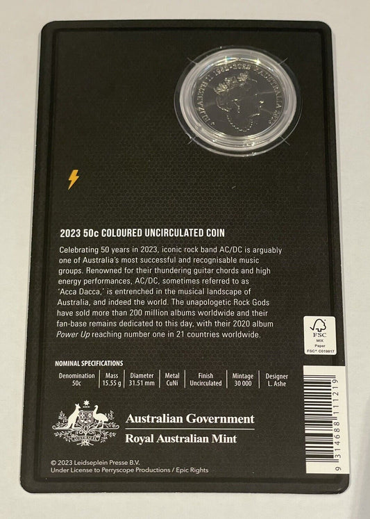2023 RAM 50c Coloured Uncirculated Coin In Card 50th Anniversary ACDC IN HAND