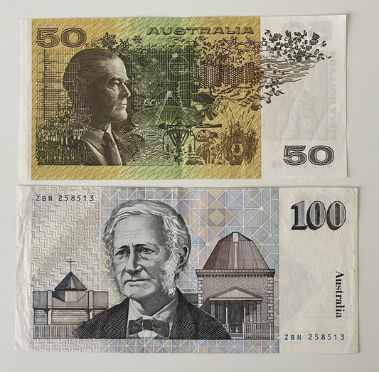 Australia $50 Fifty & $100 Hundred Paper Banknote ONE OF EACH Circ Pair