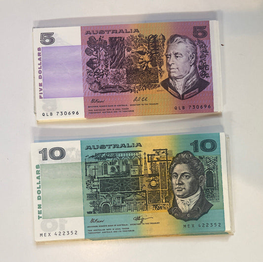 Australia $5 Five & $10 Ten Dollar NOTES - - ONE OF EACH NOTE Circulated