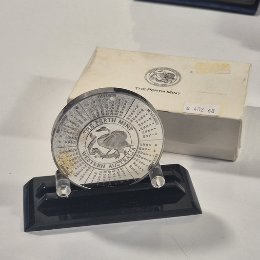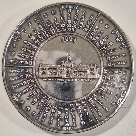 1991 Australia Perth Mint 5oz Fine Silver Calendar Medallion Vintage w/ Stand