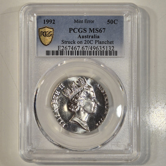 1992 50c Fifty Cents Error Struck On 20c Planchet PCGS MS67 Gem Unc