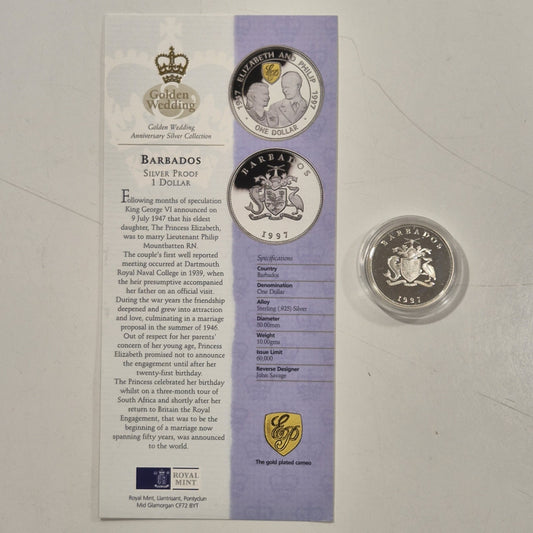 1997 $1 One Dollar Barbados Elizabeth II Philip Golden Wedding Silver Proof Coin