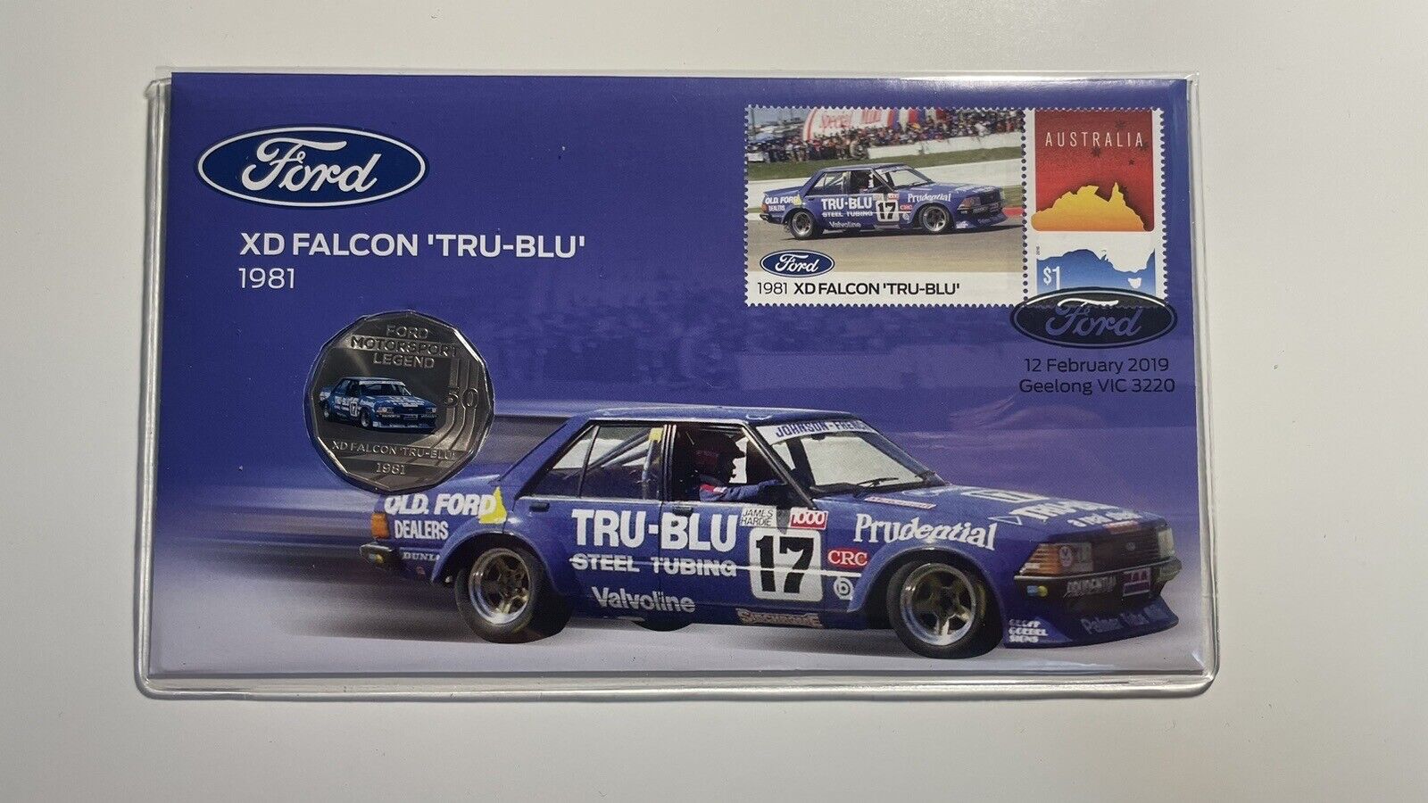 2019 Ford 1981 XD FALCON TRU-BLU PNC/FDC RAM 50cent colored coin & $1 Ford Stamp