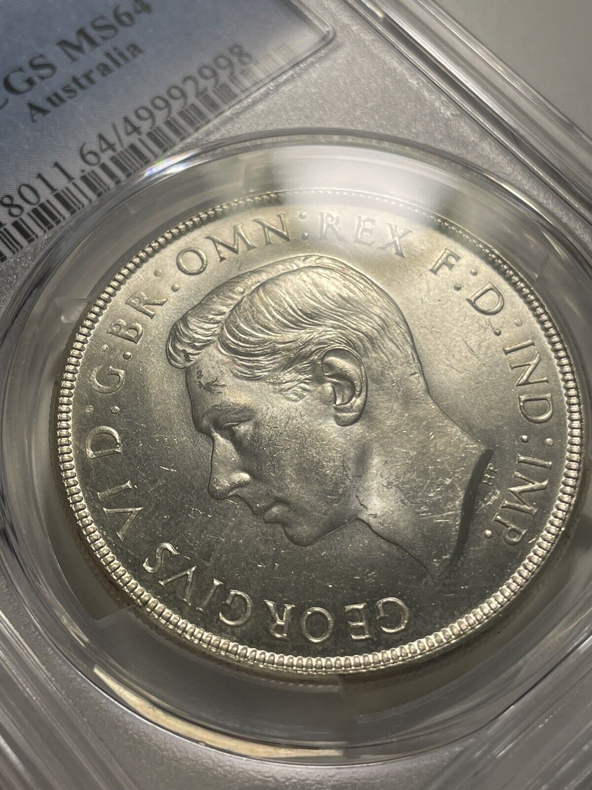 The Australia 1937 Crown Five Shillings 5/- Large Silver Coin is a stunning piece from the 1930s era. This pre-decimal coin is composed of silver and is graded MS64 by PCGS. Featuring intricate detailing and a face value of Crown, this Australian coin is a must-have for any collector. Add a piece of history to your collection with this beautiful and rare Australian coin from 1937.