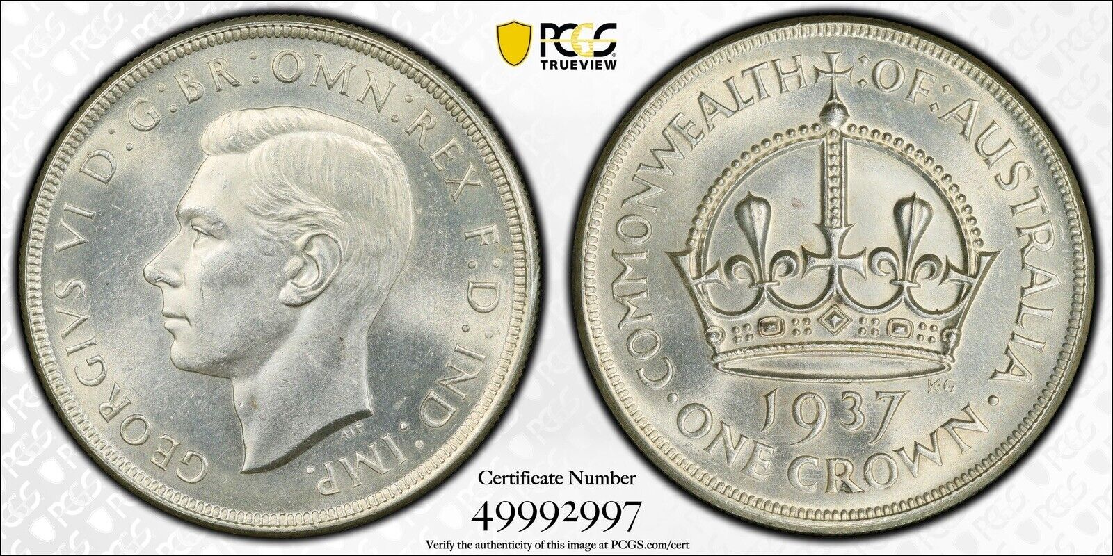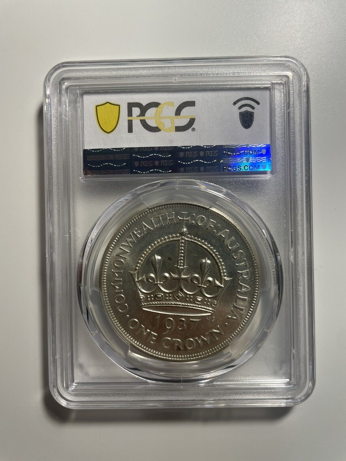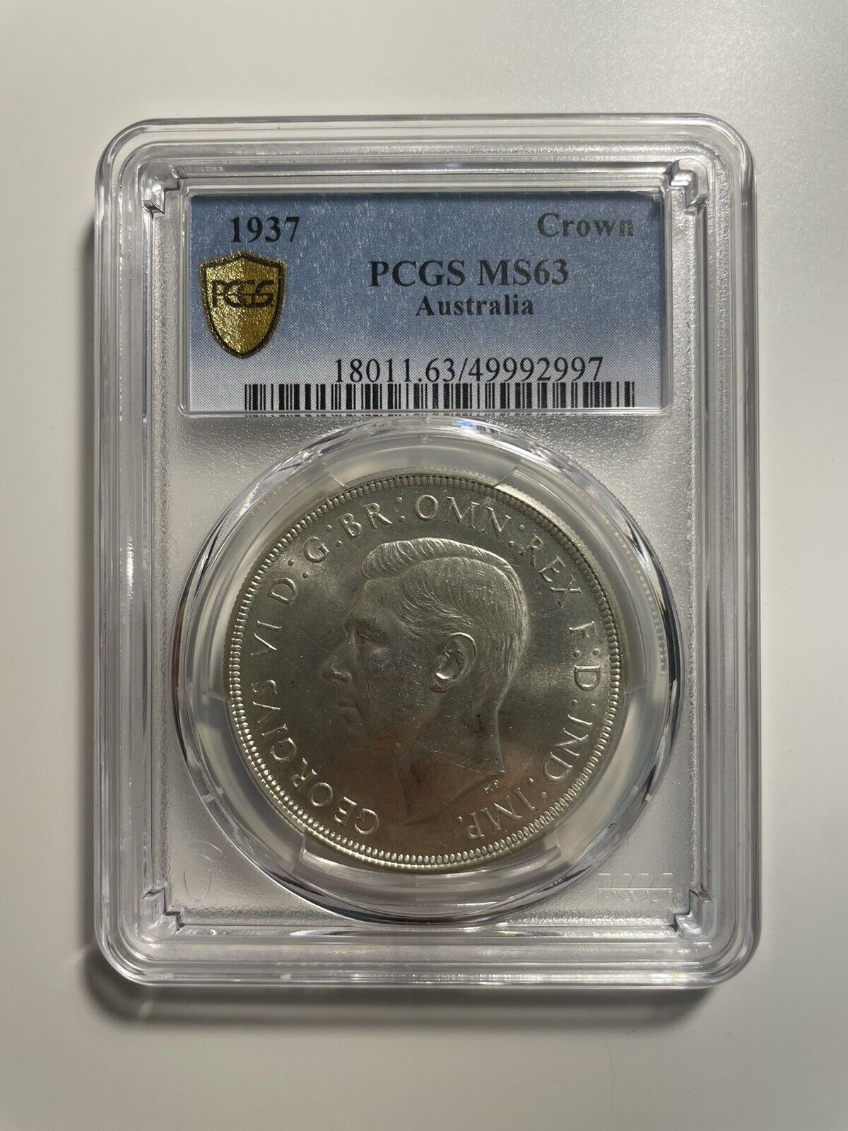 Australia 1937 Crown PCGS Graded MS63 CHU Five Shillings 5/- Large Coin KgVI. This stunning pre-decimal silver coin from the 1930s features the portrait of King George VI and is a rare find for collectors. Graded MS63 by PCGS, this coin is in mint state condition with a full strike and lustrous surfaces.