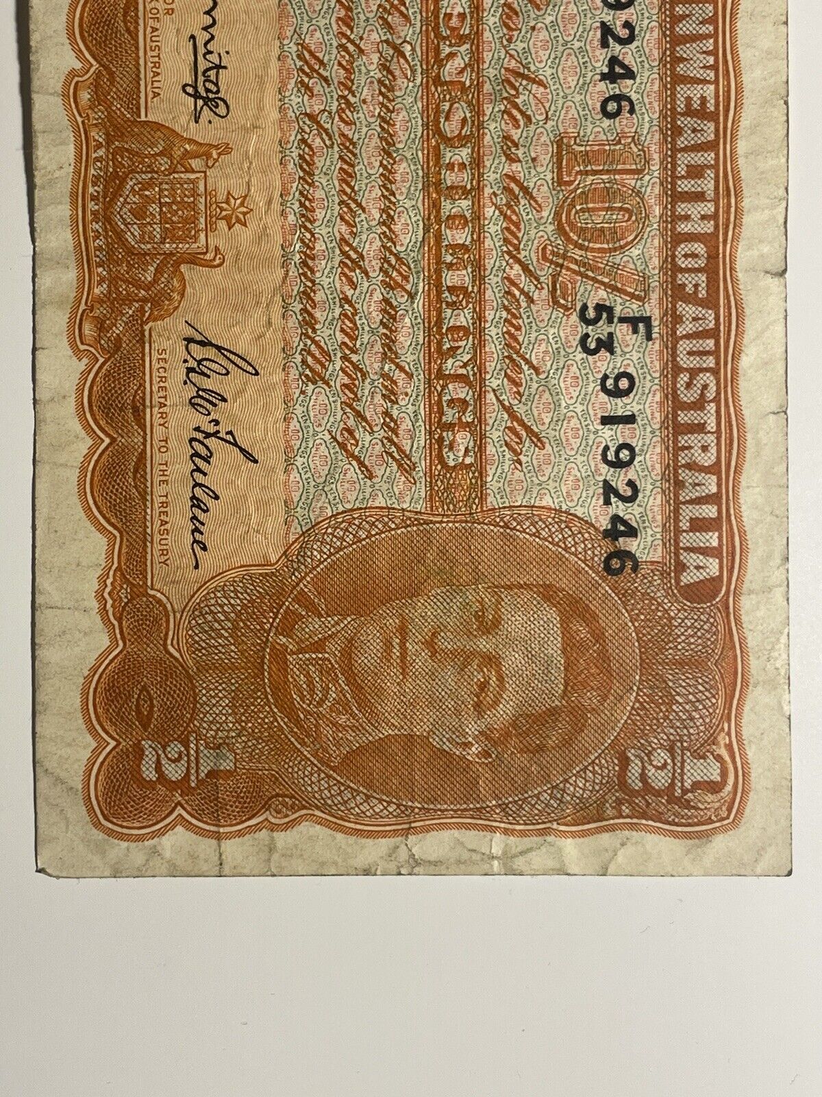 Australia 1949 Coombs Watt Pre-Decimal Ten Shilling Paper Banknote Fine is a rare and collectible piece from the 1940s era. This Australian banknote features a face value of Ten Shilling and showcases the unique design of that time. Made of paper, this historical artifact represents a piece of Australia's monetary history. Ideal for collectors of Australian coins and notes, this banknote is a must-have for those interested in the country's numismatic heritage.